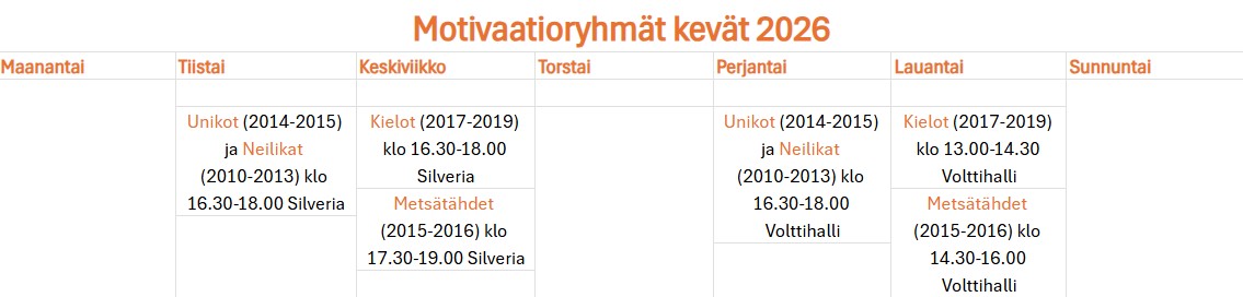 KEVÄÄN 2026 RYHMÄT JA AIKATAULUT